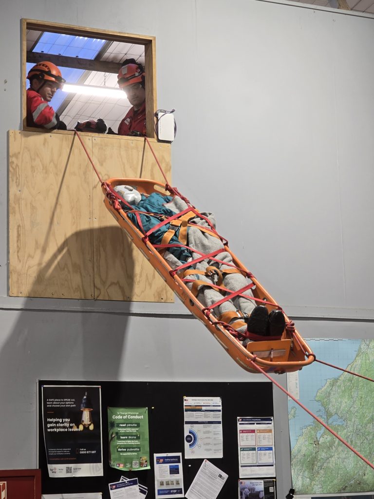 A 4-point rope set up ensured the stretcher remained horizontal throughout the manoeuvre.