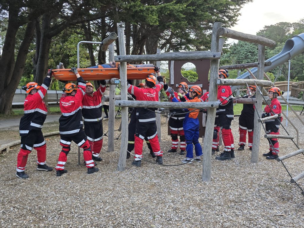 A children’s playground provided the perfect environment for practicing manoeuvring a stretcher over rough terrain and through low, narrow or awkward spaces.