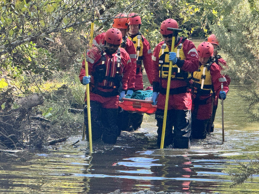 We practiced searching deep water as a team; grouped together and probing the water with wading pole to assess footing. We worked on river crossing techniques.